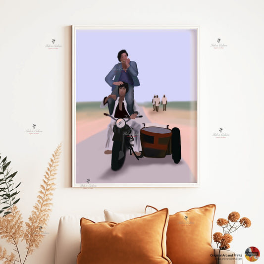 Bollywood Art,Sholay - Bike Scene,Amitabh,Movie Poster,Indian Films,Wall Decor,Desi Art Print,Drawing,Vintage film Poster,,UNFRAMED Art Prin