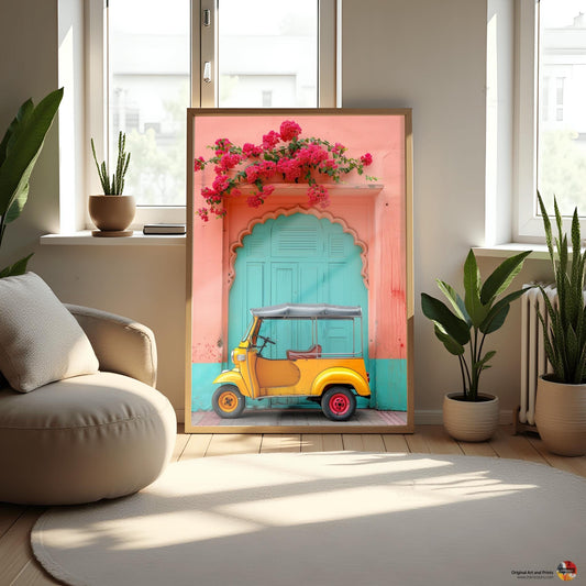Desi poster art, Digital Painting, Bougainvillea and Tuk Tuk travel print, Modern Indian colorful Art,Desi Art,Indian home decor,Printable